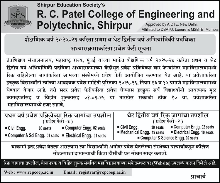 | Advertisement for FY & DSY NON CAP Admissions (Polytechnic) | Download |