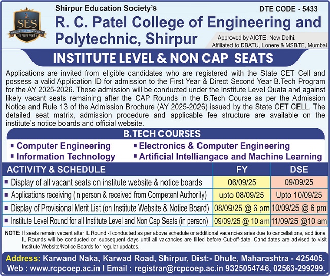R. C. Patel College of Engineering and Polytechnic (RCP COEP), Shirpur, invites applications from eligible candidates for the Institute Level Seats that includes Institute Level Quota 20% and likely seats remaining vacant after CAP Rounds for the First Year of the Four-Year Degree Courses in B. Tech. program for the academic year 2025-26.